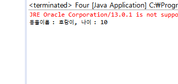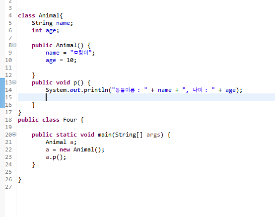 System.out.println("๋๋ฌผ์ด๋ฆ : " + name + ", ๋์ด : " + age);