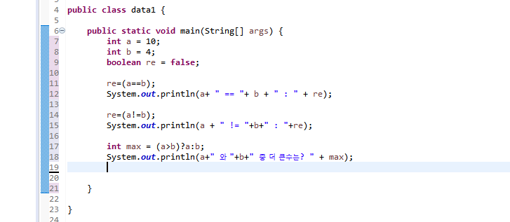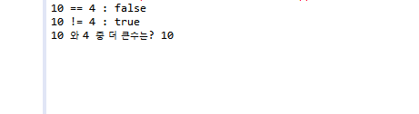 - ๋น๊ต์ฐ์ฐ์ ๊ฒฐ๊ณผ๊ฐ์ boolean ํ์ ๋๋ค. ์ฆ true or false์ด๋ค.