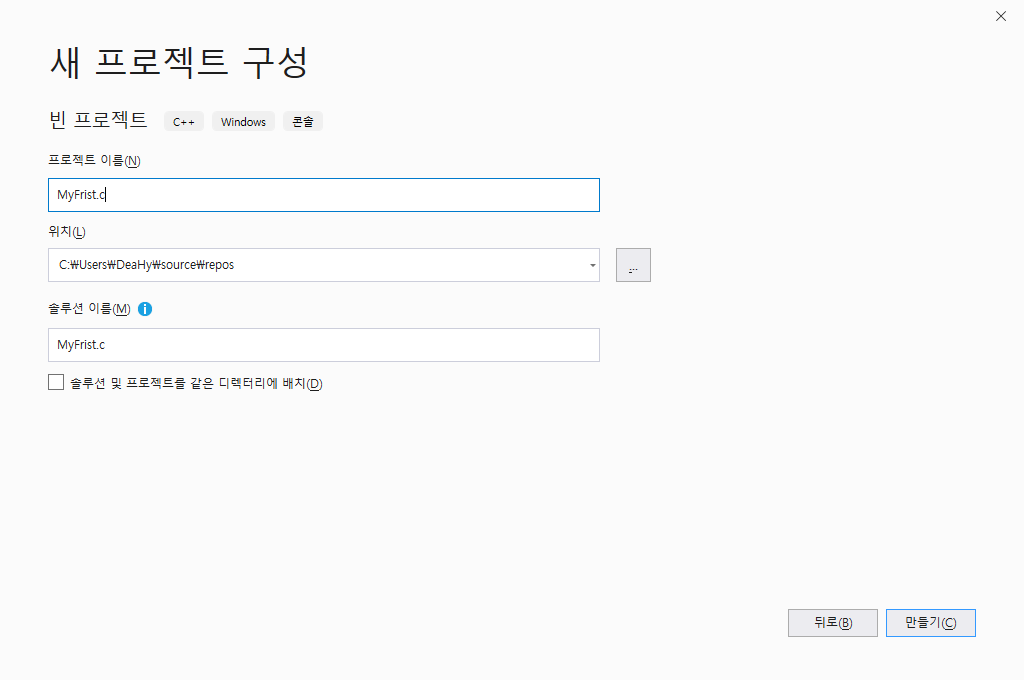 ๊ทธ๋ฌ๋ฉด ์ด๋ฌํ ํ๋ฉด์ด ๋ํ๋๋ค. ๊ทธํ, ์์คํ์ผ ํด๋ฆญ ํ ์ค๋ฅธ์ชฝ ๋ฒํผ์ ํด๋ฆญํด ์ถ๊ฐ, ์ํญ๋ชฉ์ ํด๋ฆญํด์คํ, c++ํ์ผ์ ์ ํํ, myFrist.c๋ก ๋ฐ๊ฟ์ค๋ค.